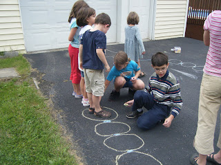 Pinta en el patio un Rosario gigante para que tus hijos vayan caminando sobre él. Primero lo que nosotros hicimos fue dibujar el Rosario con gises. Los círculos los hicimos del tamaño de los pies de los niños que participaron. Mis hijos rellenaron los círculos que correspondían a los Padres Nuestros.