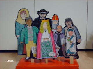 - Adivina el nombre del santo. Primero, cada niño pasa al frente a dar pistas de quién es y los demás tratan de adivinar su nombre. Lo ideal es que los niños se disfracen de ese santo, por ejemplo (de izquierda a derecha: María, Santa Teresita y San Jorge):
