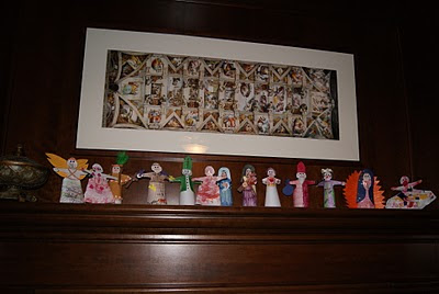 Esta es otra foto, cortesía de Cottage Blessings Aquí, Alicia, la autora del blog, hizo sus santos con cucharas de madera. Ella no siguió ningún patrón (o al menos no ví que tuviera uno) pero si la visitas, puedes ver fotos de cada uno más de cerca para darte una idea. ¿Verdad que está super su desfile de santos?